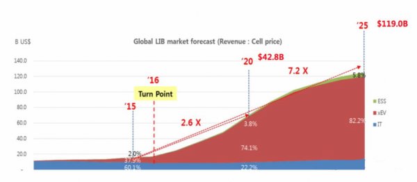 據SNE的預測截止2025年,全球動力電池市場需求將達到 1243GWh,產值將達到 979 億美元,動力電池的市場份額將占據整個鋰離子電池市場份額的82.2%左右,將對鋰離子電池行業(yè)產生決定性的影響。